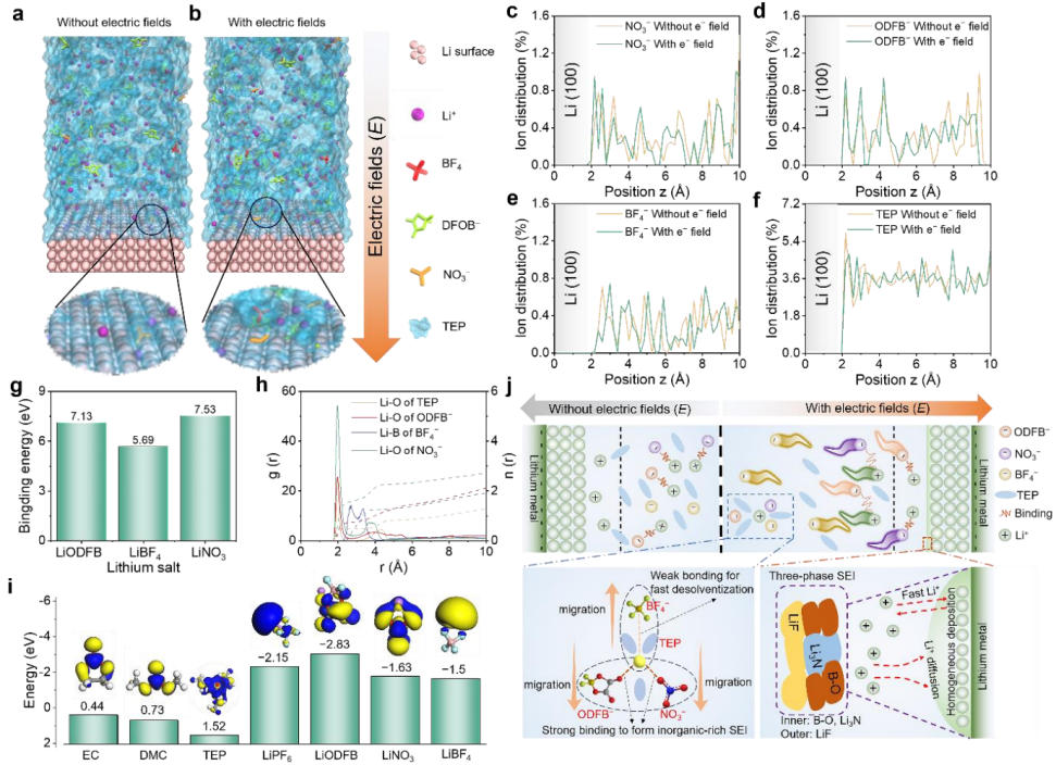 面对这一挑战,我院研究团队设计了一种以磷酸三乙酯(TEP)为单一溶剂的本征不可燃电解液体系,并引入多种锂盐进行精准调控。研究的亮点在于“电场调控阴离子运动方向”这一核心机制。团队敏锐地捕捉到不同阴离子与锂离子结合能的差异,利用外加电场的导向作用,指挥阴离子在电极表面“各就各位”,从而构筑出具有明确功能分区的“三相”固态电解质界面(SEI):内层“守门员”(富含Li3N)——由强结合力的ODFB-和NO3-阴离子在电场驱动下优先分解形成,不仅提供了极高的离子电导率,更显著降低了界面阻抗,确保离子快速、均匀通过;中层“缓冲垫”(B-O玻璃态)——作为低结晶度的过渡层,它赋予了SEI膜优异的机械柔韧性和形变自修复能力,有效抑制了锂枝晶的刺穿;外层“装甲层”(富含LiF)——由弱结合力的BF4-阴离子在外层形成,提供了极高的硬度和化学稳定性,像一层坚不可摧的铠甲,抵御高电压正极的氧化侵蚀。这种“内柔外刚、导离子与阻电子”协同作用的智能界面,完美解决了传统SEI膜“一损俱损”的结构缺陷。