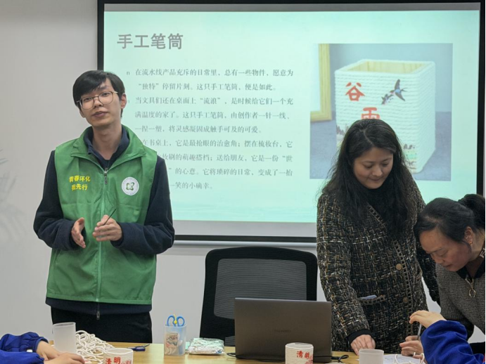 探秘手工技艺,感悟创作之美。活动伊始,志愿者为参与者带来一场生动的“手工笔筒文化小课堂”。通过图文展示与实物讲解,志愿者详细介绍了笔筒的历史渊源与制作工艺——从古代文房雅器到创意手作,笔筒不仅承载着收纳功能,更融合了美学设计与个性表达,成为兼具实用与艺术的生活小物。